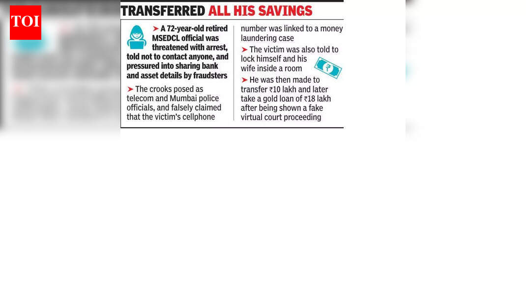 पुणे: बारामती तालुक्यातील 72 वर्षीय सेवानिवृत्त महाराष्ट्र राज्य वीज वितरण कंपनी लिमिटेड (MSEDCL) अधिकाऱ्याची 30 नोव्हेंबर ते 13 डिसेंबर दरम्यान डिजिटल अटक फसवणूक करून 28 लाख रुपयांची फसवणूक करण्यात आल्याचा आरोप आहे. फसवणूक करणाऱ्यांनी त्याला त्याची सर्व बचत तर हस्तांतरित केलीच, पण त्याचे सोन्याचे दागिने गहाण ठेवण्यासही भाग पाडले. पीडित तरुणीने नुकतीच पुणे ग्रामीण पोलिसांत तक्रार दाखल केली.पुणे ग्रामीण पोलिसांच्या एका अधिकाऱ्याने TOI ला सांगितले की, 30 नोव्हेंबर रोजी पीडित तरुणी बाजारात असताना एका अज्ञात सेलफोन नंबरवरून कॉल आला. फोन करणाऱ्या महिलेने दूरसंचार विभागाची अधिकारी असल्याचे भासवले. आपल्या मोबाईल नंबरचा गैरवापर होत असल्याची माहिती तिने पीडितेला दिली. त्यानंतर हा कॉल एका व्यक्तीकडे हस्तांतरित करण्यात आला ज्याने स्वतःची ओळख मुंबई पोलिसांमध्ये अधिकारी म्हणून दिली होती.“कॉलरने पीडितेला घरी परत येण्याची आणि कोणाशीही चर्चा न करण्याची सूचना केली. पीडितेला सांगण्यात आले की त्याचे नाव मनी लाँड्रिंग प्रकरणात समोर आले होते आणि अटक वॉरंट जारी करण्यात आले होते,” अधिकाऱ्याने सांगितले.घरी पोहोचल्यानंतर कॉलरने पीडितेला स्वत:ला आणि पत्नीला एका खोलीत बंद ठेवण्यास सांगितले. पीडितेच्या बँक खात्यातून 2 कोटी रुपयांचे संशयास्पद व्यवहार झाल्याचा दावा कॉलरने केला आहे. त्यानंतर, दुसऱ्या व्यक्तीने, वरिष्ठ पोलीस अधिकारी म्हणून दाखवून, कॉलमध्ये सामील झाले आणि पीडितेला संभाव्य अटकेचा इशारा दिला, त्याला 538 कोटी रुपयांच्या मोठ्या आर्थिक फसवणुकीच्या प्रकरणाशी खोटे जोडले.“कॉलरने पीडितेला असेही सांगितले की व्यावसायिकाचे साथीदार पीडितेची हत्या करू शकतात, त्यामुळे त्याच्या घराबाहेर साध्या वेशातील पोलिस तैनात करण्यात आले आहेत,” अधिकारी म्हणाला.कॉलरने, पीडितेला घाबरवण्यासाठी, असेही सांगितले की व्यावसायिकाच्या सहाय्यकांनी एका व्यक्तीच्या मुलीवर लैंगिक अत्याचार केले ज्याने न्यायालयात व्यावसायिकाचे नाव उघड केले आणि त्याची पत्नी आणि मुलाची हत्या केली. “कॉलरने पीडितेला असेही सांगितले की दिल्ली आणि झारखंडच्या माजी मुख्यमंत्र्यांना अशाच एका गुन्ह्यात अटक करण्यात आली होती आणि त्यांना त्यांच्या पदांचा राजीनामा द्यावा लागला. बदमाशांनी नंतर त्याच्या बँक बॅलन्स आणि मालमत्तेचा तपशील घेतला आणि 4 डिसेंबर रोजी त्याला 10 लाख रुपये एका बँक खात्यात हस्तांतरित केले,” अधिकाऱ्याने सांगितले.दुसऱ्या दिवशी, फसवणूक करणाऱ्यांनी कथितरित्या एक बनावट आभासी सर्वोच्च न्यायालयाची कार्यवाही केली, ज्यामध्ये न्यायाधीश आणि वकील म्हणून ओळखल्या जाणाऱ्या व्यक्तींचा समावेश होता 