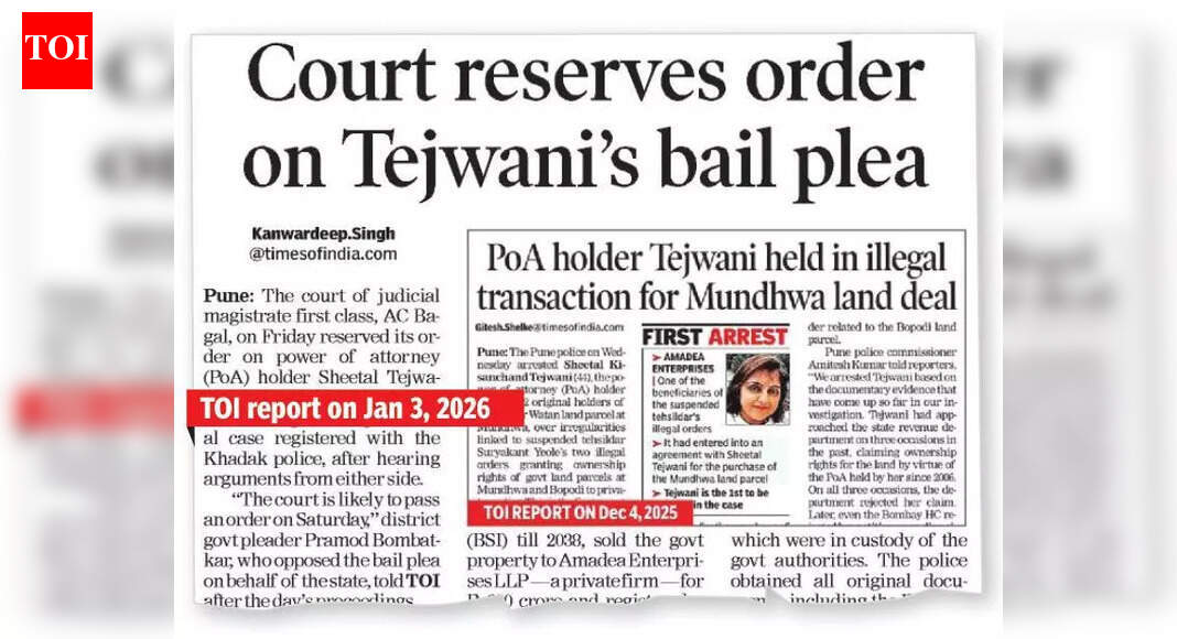 पुणे: न्यायदंडाधिकारी प्रथमवर्ग अलिशा सी बागल यांनी मुंढवा सरकारी जमीन पार्सल व्यवहाराशी संबंधित प्रकरणात पॉवर ऑफ ॲटर्नी (पीओए) धारक शीतल तेजवानी यांचा जामीन अर्ज फेटाळला आहे. न्यायदंडाधिकारी यांनी पक्षकारांनी दाखल केलेल्या एफआयआर, रिमांड अहवाल आणि कागदपत्रांचा संदर्भ 3 जानेवारी रोजी दिला: “अर्जदार/आरोपी (तेजवानी) यांनी मुंढवा येथील सरकारी मालमत्ता मंजूरीशिवाय आणि आवश्यक मुद्रांक शुल्क न भरता विकली आणि सरकारची फसवणूक केली असल्याचे प्रथमदर्शनी दिसते.” “हे आरोप गंभीर आहेत,” बागल म्हणाले आणि पुढे म्हणाले, “कथित व्यवहारात मोठ्या रकमेचा समावेश आहे आणि त्यासंदर्भात चौकशी सुरू आहे.”मुंढवा संपत्ती सरकारची नसून वतनदारांची आहे, या तेजवानी यांच्या म्हणण्यावर, न्यायालयाने सांगितले की, तपास सुरू असल्याने या टप्प्यावर या पैलूवर निर्णय घेता येणार नाही. “जर या टप्प्यावर, अर्जदार/आरोपीला जामिनावर सोडण्यात आले, तर ती फिर्यादीच्या पुराव्याशी छेडछाड करू शकते, ती फिर्यादी साक्षीदारांवर प्रभाव टाकू शकते आणि खटल्यासाठी उपलब्ध होऊ शकत नाही,” दंडाधिकारी म्हणाले. गुन्ह्याचे गंभीर स्वरूप लक्षात घेऊन अर्जदार/आरोपी एकल माता असणे आणि विविध आजारांनी ग्रासलेले जामीन मिळवण्यासाठी या कारणांवर अवलंबून राहू शकत नाही, असेही न्यायालयाने नमूद केले. 40 सरकारी जमीन आणि मुनसेलवाड जमीन मालकी हक्क ओळखून येवले यांच्या दोन बेकायदेशीर आदेशांबाबत निलंबित तहसीलदार सूर्यकांत येवले आणि इतर आठ जणांविरुद्ध नायब तहसीलदार प्रविणा एस बोर्डे यांनी 7 नोव्हेंबर 2025 रोजी दाखल केलेल्या तक्रारीच्या आधारे पुणे पोलिसांनी तेजवानी यांना 3 डिसेंबर 2025 रोजी अटक केली. बोपोडी येथे 5.35-हेक्टर सरकारी जमीन खाजगी पक्षांच्या नावे.पोलिसांचे प्रकरण असे आहे की, मुंढवा येथील महार वतन जमीन पार्सलच्या २७२ मूळ धारकांच्या वतीने पीओए धारण करणाऱ्या तेजवानीने – आता सरकारकडे आहे आणि बॉटनिकल सर्व्हे ऑफ इंडियाला (BSI) 2038 पर्यंत भाडेपट्टीवर दिलेले आहे – यांनी सरकारी मालमत्ता Amadea Enterprises LLP यांना विकली, ज्यामध्ये मुख्य मंत्री, पवरजित यांचा मुलगा भागीदार आहे. 300 कोटी रुपये आणि 20 मे 2025 रोजी कोणत्याही अधिकाराशिवाय विक्री कराराची नोंदणी केली.अमेडिया एंटरप्रायझेसने २६ मे २०२५ रोजी येवले यांच्यासमोर मुंढवा जमीन ताब्यात घेण्यासाठी अर्ज दाखल केला. 9 जून 2025 रोजी येवले यांनी बीएसआयला जमीन रिकामी करण्याचे निर्देश दिले. FIR मध्ये पार्थ पवार यांचे नाव नसले तरी येवले यांच्या 9 जून 2025 च्या आदेशात अमेडाचे अन्य भागीदार दिग्विजय पाटील आणि तेजवानी यांची नावे लाभार्थी म्हणून आहेत.जिल्हा सरकारी वकील प्रमोद बोंबटकर यांनी जामीन याचिकेला विरोध करत