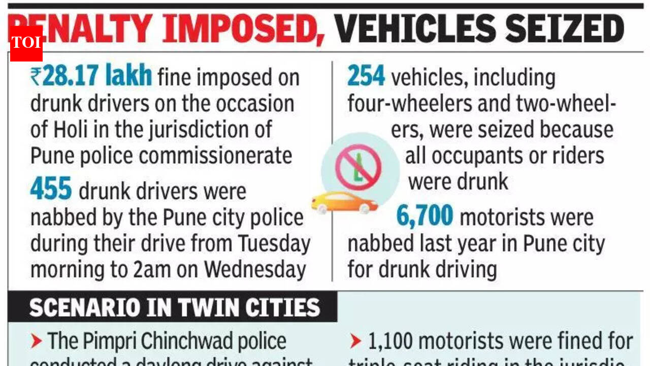 पुणे : होळीच्या मुहूर्तावर मद्यप्राशन करून वाहन चालवणाऱ्या पुणे आणि पिंपरी चिंचवडमध्ये एकूण 676 वाहनचालकांना अटक करण्यात आली आहे.पुणे शहर पोलिस आणि पिंपरी चिंचवड पोलिसांनी मंगळवारी विशेष मोहीम राबवून मद्यधुंद वाहनचालकांना अटक केली. पिंपरी चिंचवडचे पोलिस उपायुक्त (वाहतूक), विवेक पाटील यांनी TOI ला सांगितले की, “आम्ही पिंपरी चिंचवडमध्ये दिवसभर मोहीम राबवली आणि 221 मद्यधुंद वाहनचालकांना पकडले. याव्यतिरिक्त, आम्ही ट्रिपल-सीट रायडिंगसाठी 1,100 वाहनचालकांना दंड ठोठावला.”पुण्याचे अतिरिक्त पोलिस आयुक्त मनोज पाटील म्हणाले, “आम्ही मंगळवारी सकाळी आमची मोहीम सुरू केली आणि बुधवारी पहाटे 2 वाजेपर्यंत सुरू राहिली. आमच्या पथकांनी पुणे शहरातील 455 मद्यधुंद वाहनचालकांना पकडले.”पोलिस उपायुक्त (वाहतूक), पुणे, हिम्मत जाधव म्हणाले, “आम्ही चारचाकी आणि दुचाकींसह 254 वाहने जप्त केली आहेत, कारण सर्व वाहनधारक किंवा स्वार मद्यधुंद अवस्थेत होते. आम्ही त्यांना अशा स्थितीत मोटार वाहने चालवण्यास किंवा चालविण्यास परवानगी देऊ शकत नाही.”पुणे शहर वाहतूक पोलिसांनी येरवडा वाहतूक पोलिस मुख्यालयात दारू पिऊन वाहन चालवणाऱ्यांसाठी समुपदेशन सत्राचे आयोजन केले होते.पाटील म्हणाले, “आम्ही मद्यपान करून वाहन चालवणाऱ्यांची सर्व प्रकरणे पुढील कायदेशीर कारवाईसाठी न्यायालयात पाठवण्याचा निर्णय घेतला आहे. शिवाय, मद्यपान करून वाहन चालवणाऱ्यांचा वाहन परवाना जप्त करू आणि ते रद्द करण्याची विनंती प्रादेशिक परिवहन कार्यालयाला (आरटीओ) करू.” ते म्हणाले की, या वर्षाच्या पहिल्या दोन महिन्यांत वाहतूक पोलिसांनी मद्यपान करून वाहन चालवणाऱ्या 2,550 वाहनचालकांना पकडले. “आम्ही मंगळवारी दारू पिऊन वाहन चालवल्याबद्दल वाहनचालकांना रु. 28.17 लाखांचा दंड ठोठावला. आम्ही गेल्या वर्षी 6,700 वाहनचालकांना दारू पिऊन गाडी चालवल्याबद्दल पकडले,” तो म्हणाला.पाटील म्हणाले की, वारंवार गुन्हेगार शोधण्यासाठी पोलीस अभ्यास करत आहेत. त्यांच्यावर कठोर कायदेशीर कारवाई केली जाईल, असे ते म्हणाले.“आम्ही मद्यधुंद वाहनचालकांविरुद्धच्या कारवाईत एक आश्चर्यकारक घटक आणला आहे. आम्ही सकाळच्या वेळेत निवडक रस्त्यांवर तपासणी करतो, तर संध्याकाळच्या नाका बंदीची ठिकाणे अधिक गुन्हेगारांना पकडण्यासाठी वारंवार बदलली जातात. आम्ही सकाळी उशिरापर्यंत मद्यधुंद वाहनचालकांना पकडले, जे पूर्वी असे नव्हते,” पाटील म्हणाले.