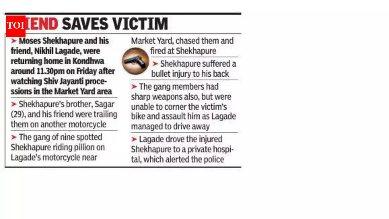 पुणे : डायस प्लॉटजवळील बंदोबस्तातून नऊ जणांच्या टोळीने कोंढवा येथील जुन्या प्रतिस्पर्ध्याचा तीन मोटारसायकलवरून पाठलाग करून गंगाधाम चौकात शुक्रवारी मध्यरात्रीच्या सुमारास दोन राऊंड गोळीबार केला.मार्केट यार्ड पोलिसांनी मोशे शेखापुरे (२२) असे पीडित तरुणाचे नाव आहे. त्याचा मित्र निखिल लगाडे याने चालविलेल्या मोटारसायकलवरून मागे जात असताना त्याच्या पाठीला गोळी लागली. मार्केट यार्ड परिसरात शिवजयंती मिरवणूक पाहून ते कोंढवा येथे घरी परतत असताना त्यांच्यावर हल्ला झाला. “शेखापुरे यांना धनकवडी येथील खासगी रुग्णालयात दाखल करण्यात आले आहे. पाठलाग करून जिवे मारण्याचा प्रयत्न करणाऱ्या नऊ जणांची त्यांनी ओळख पटवली आहे,” असे मार्केट यार्ड पोलिसांचे वरिष्ठ निरीक्षक विश्वजित जगताप यांनी सांगितले.मध्यरात्री हा हल्ला पंधरवड्यानंतर झाला आहे, ज्यांना ताज्या घटनेत सामील असलेल्या नऊ जणांनाही ओळखले जाते, अशा चार अल्पवयीन मुलांनी डायस प्लॉट येथे दहशत पसरवण्यासाठी आणि लोकांना धमकावण्यासाठी हवेत दोन गोळ्या झाडल्या. चौघांना निरीक्षण गृहात ठेवण्यात आले आहे.पोलिस उपायुक्त (झोन II) मिलिंद मोहिते म्हणाले, “आमच्या पथकाने (शनिवारी) सायंकाळी पाच संशयितांना अटक केली – बालाजी उमाप (22) आणि साहिल चव्हाण (20, दोघेही रा. गुलटेकडी), राजू उमप (55) आणि शुभम दिलीप पवार (20, सहकारनगर), आणि आनंद 2क्गाव रोडवरील बुधगाव उमाप (20) यांना अटक केली. ताज्या घटनेच्या संदर्भात उर्वरित चौघांचा शोध सुरू आहे.वरिष्ठ निरीक्षक जगताप म्हणाले, “आम्हाला घटनास्थळी एक रिकामे काडतूस सापडले, परंतु पीडितेने आम्हाला सांगितले की संशयितांनी दोन राऊंड गोळीबार केला. टोळीच्या सदस्यांकडे धारदार शस्त्रे देखील होती, परंतु पीडितेच्या दुचाकीला कोपरा करून त्याच्यावर हल्ला करण्यात ते असमर्थ ठरले कारण लगडे तेथून पळून जाण्यात यशस्वी झाले. लगडे यांनी जखमीला शेखापुरेला नेले, पोलिसांनी एका खाजगी रुग्णालयात दाखल केले.”सहायक पोलिस आयुक्त राहुल आवारे म्हणाले, “आपल्या प्राथमिक जबाबात शेखापुरेने तपास अधिकाऱ्यांना सांगितले की, मागील वर्षीच्या नवरात्रोत्सवादरम्यान मार्केट यार्ड परिसरात कार्यरत असलेल्या गुन्हेगारी टोळीच्या म्होरक्याशी त्याचे भांडण झाले होते. टोळीचे सदस्य तेव्हापासून स्कोअर सेट करण्यासाठी त्याच्या मागे लागले होते, असे त्याने पोलिसांना सांगितले.”शुक्रवारी रात्री 11.30 च्या सुमारास मार्केट यार्डजवळ शेखापुरे यांच्या मोटारसायकलवर नऊ जणांच्या टोळक्याने पाठलाग करताना दिसले आणि त्यांचा पाठलाग सुरू केला. शेखापुरे यांचा भाऊ सागर (२९) आणि त्याचा मित्र दुसऱ्या मोटारसायकलवरून त्यांचा माग काढत होते, असे जगताप यां