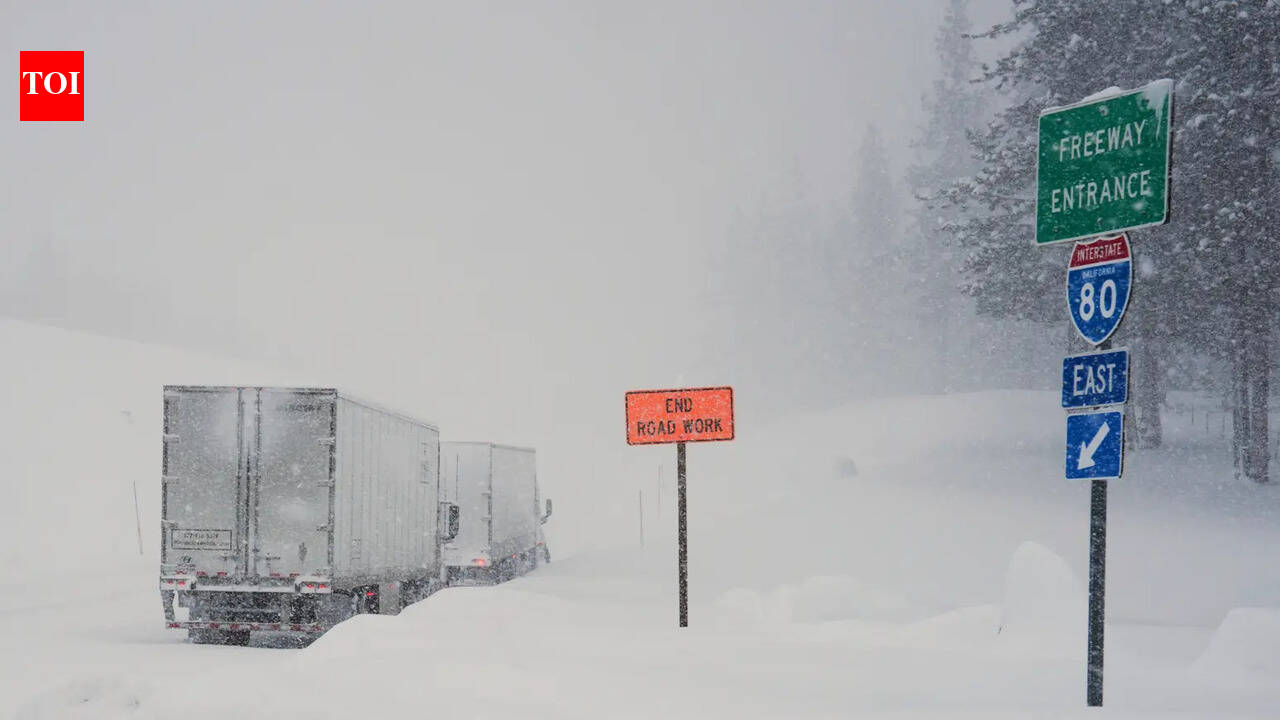 ट्रक्स कॅलिफोर्नियामध्ये मंगळवार, 17 फेब्रुवारी 2026 रोजी वादळादरम्यान आंतरराज्यीय 80 वर ट्रक रांगेत उभे आहेत. (एपी फोटो/ब्रूक हेस-होमियर) क्रूने आठ बॅककंट्री स्कायर्सचे मृतदेह बाहेर काढले